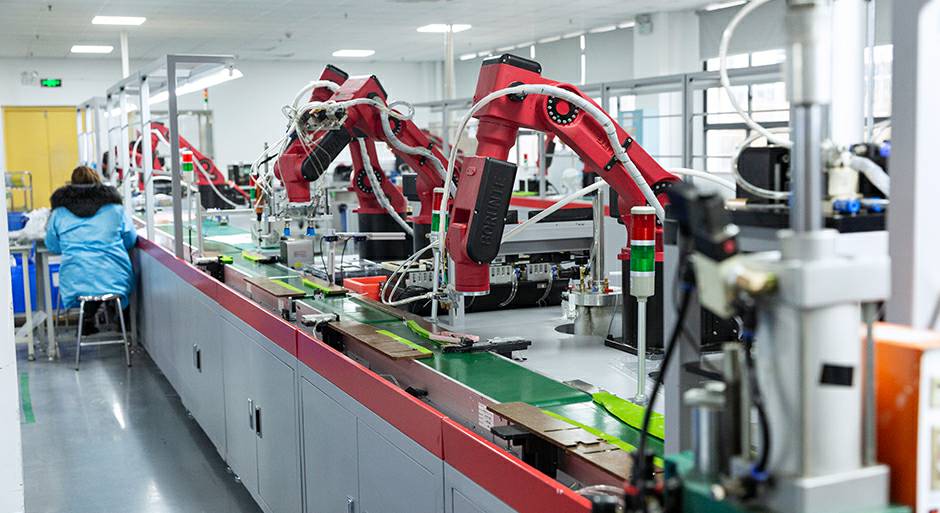 全自动化生产线6条,通过机械手臂上下料,其它自动化装置配合,逐项完成PCBA ATE检控、贴青稞纸、电芯点焊、螺丝固定、定点打胶、装壳、重量检测等。